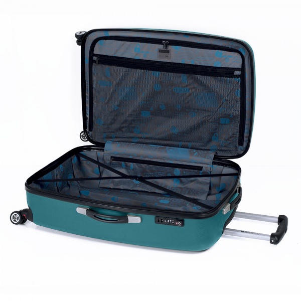- Чемодан разделен перегородкой на молнии на два основных отделения, перегородка имеет сетчатый карман на молнии