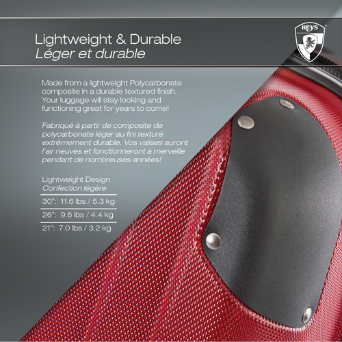 Чемоданы Heys Velocity выполнены из очень легкого, эластичного и в то же время прочного материала. Благодаря своим свойствам, поликарбонат композитный (Polycarbonate Composite) устойчив к деформациям (после деформации принимает прежнюю форму), не растрескивается на морозе, также используется при изготовлении пуленепробиваемых стекол. Наиболее уязвимые, угловые части чемодана, защищены дополнительными противоударными накладками.