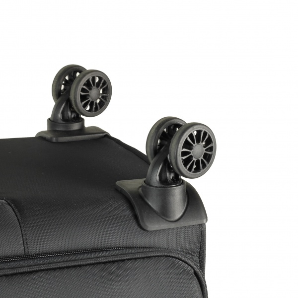 Для большей безопасности вещей предусмотрен удобный кодовый замок системы TSA. Внутри чемодан оснащен компрессионными стяжками и карманом на молнии. Мелкие вещи и вещи первой необходимости можно разместить в фасадном внешнем кармане. Четыре полноповоротных сдвоенных полиуретановых колеса обеспечивают плавный ход и простое управление чемоданом с помощью телескопической ручки, фиксируемой в двух положениях. Для защиты чемодана от внешних повреждений предусмотрена пластиковая защита дна и углов корпуса. Предусмотрена возможность увеличить полезный объем чемодана до 10%, благодаря наличию клапана, расстегнув специальную молнию по периферии чемодана.
